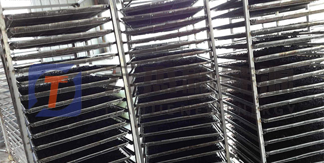 1)桑葚裝盤:使用桑椹烘干機(jī)烘干處理,時(shí)間要18個(gè)小時(shí)就可以烘干處理完了。一般每4公斤鮮桑葚可制成1公斤桑葚干。將經(jīng)整理去雜后的桑葚裝入托盤,送進(jìn)物料車內(nèi)。每臺(tái)物料車不宜超過14個(gè)托盤,托盤層間距控制在10公分左右。以10P機(jī)為例,不要超過10臺(tái)物料車,以保證桑葚烘干機(jī)內(nèi)有合理間隙位,利于熱風(fēng)通過。