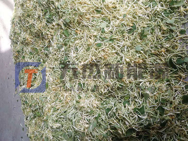 開(kāi)始烘干時(shí),金銀花烘干設(shè)備溫度控制在30-35℃;2h后將金銀花烘干機(jī)溫度提高到40℃左右;再經(jīng)5-10h,溫度提高到45-50℃,維持10h;接著溫度提到55-58℃,不得超過(guò)60℃,烘干總時(shí)間為24h。溫度過(guò)高烘干過(guò)急,則金銀花花蕾發(fā)黑,質(zhì)量下降;溫度太低,烘干時(shí)間過(guò)長(zhǎng),則花色不鮮,呈黃白色,也影響質(zhì)量。陰天雨天須微溫烘干,金銀花烘干設(shè)備先以35℃-40℃微溫烘金銀花2-3小時(shí),再升高到50℃溫度烘到9成干,不破損。一般6-7公斤鮮金銀花烘干1公斤物料。