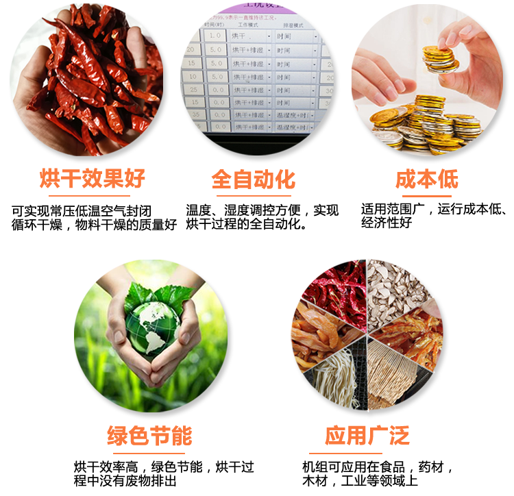 熱泵烘干機烘干出來的物料效果好,可實現(xiàn)常壓低溫空氣封閉循環(huán)干燥,物料干燥的質(zhì)量好。全自動化,烘干過程中的溫度濕度調(diào)控方便,實現(xiàn)烘干過程的全自動化。一機多用,適用范圍廣,運行成本低,經(jīng)濟性好。烘干過程中沒有廢物排出,綠色節(jié)能,烘干效率高。熱泵烘干機可應(yīng)用在食品,藥材,木材,工業(yè)等領(lǐng)域上。歡迎您聯(lián)系我們了解中藥材烘干機、辣椒烘干機、香菇烘干機、金銀花烘干機等更多產(chǎn)品。