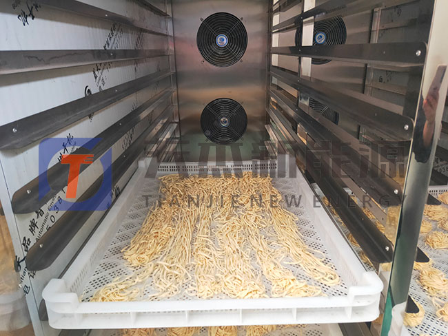 保潮發(fā)汗:此區(qū)以水分內(nèi)擴(kuò)散為主,強(qiáng)化通風(fēng),使空氣循環(huán)暢通,此時跨區(qū)溫度上升,不要過“急”,要使溫度形成“梯度”,保持適當(dāng)?shù)臐穸?。面條烘干房烘干時間約控制在30-40分鐘,烘干溫度30-35℃,空氣濕度75-85%RH。