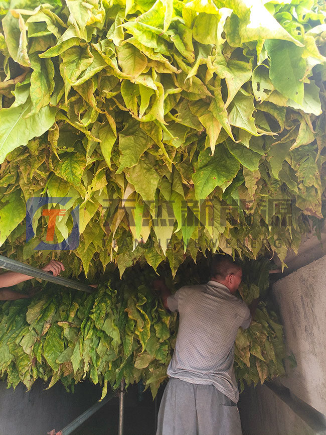 前期煙葉編裝的時候要使煙葉間距平均,有利于熱風進行循環(huán),這樣煙葉各部分才能受熱均勻,在綁桿的時候需要遵循一個原則,成熟稍差的煙葉放在溫度低的地方,成熟的煙葉放在中間層,過熟的煙葉放在溫度高的地方,當天采收的煙葉當天進入煙草烘干烤房。煙葉烘干的前期為變色期,使煙葉變軟,溫度需要控制在38度以內(nèi),濕度控制在90%以上
