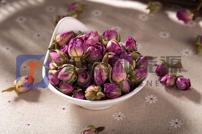 干花蕾出爐:烘干車進(jìn)入玫瑰花烘干房大約8小時(shí),只要色澤鮮艷,具有玫瑰特有的香氣,花蕾呈飽滿錘形,顏色為紫紅色或醬紫紅色,花托、花萼為黃綠色,用手捻花蕾呈粉片狀,花托70-80%的用手捻碎后呈粉絲狀時(shí),表示已干透,此時(shí)裝滿干花蕾的烘干車就可以推出玫瑰花烘干房。