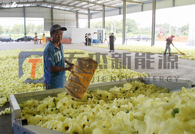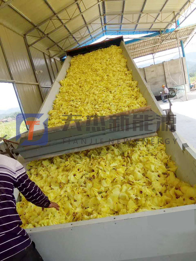 將新鮮的黃蜀葵均勻的放入傳送帶上送至汝陽(yáng)黃蜀葵烘干設(shè)備中進(jìn)行烘干